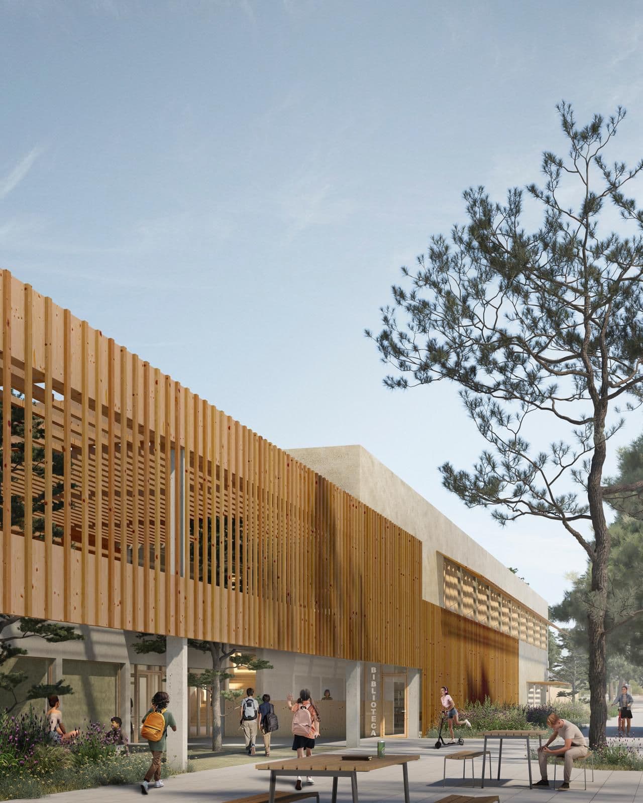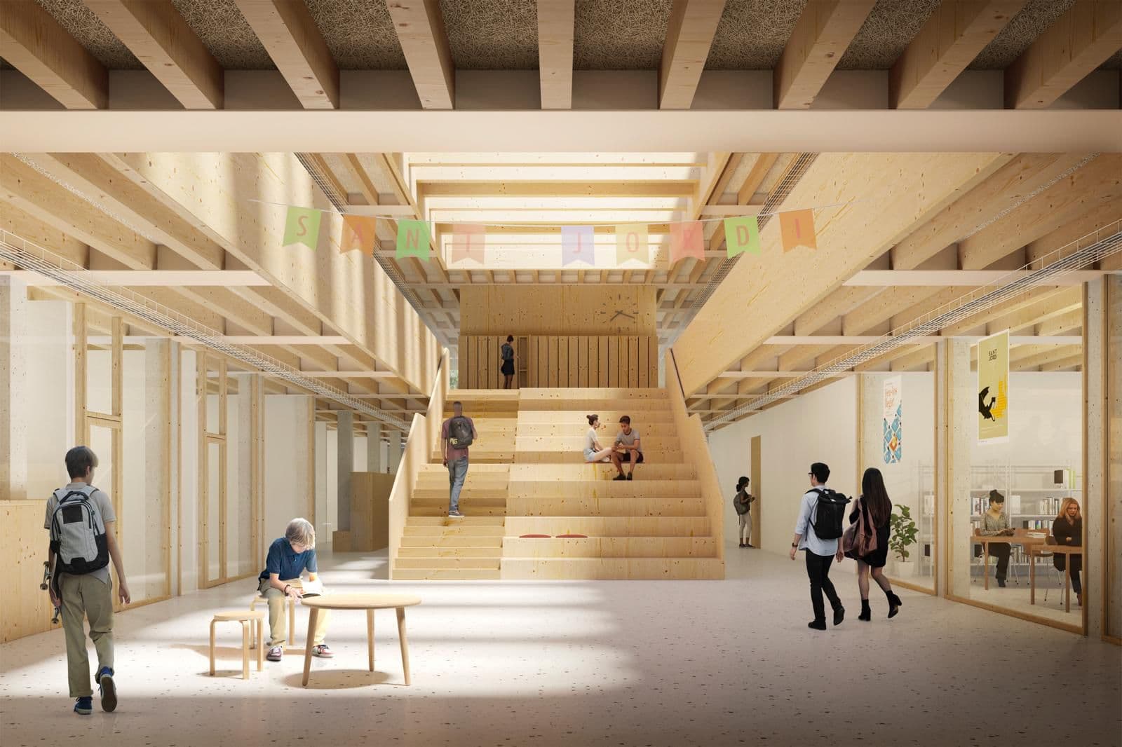 L’edifici crea una transició d’espais exterior-interior pròpia del clima mediterrani: plaça – gelosia – pòrtic – atri interior – espais docents. El projecte respecta i dinamitza el context natural circumdant, oferint múltiples opcions de joc a la natura.