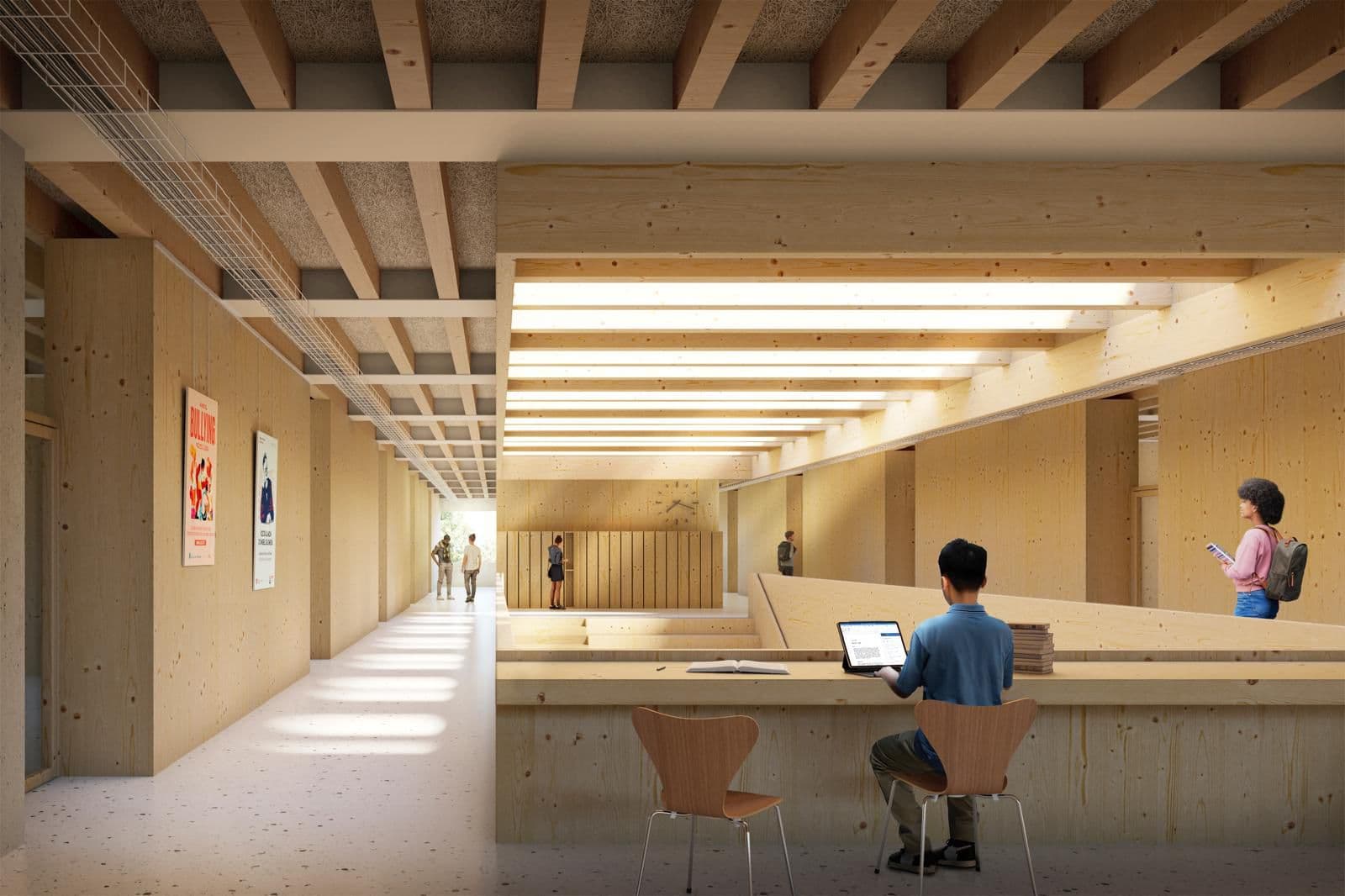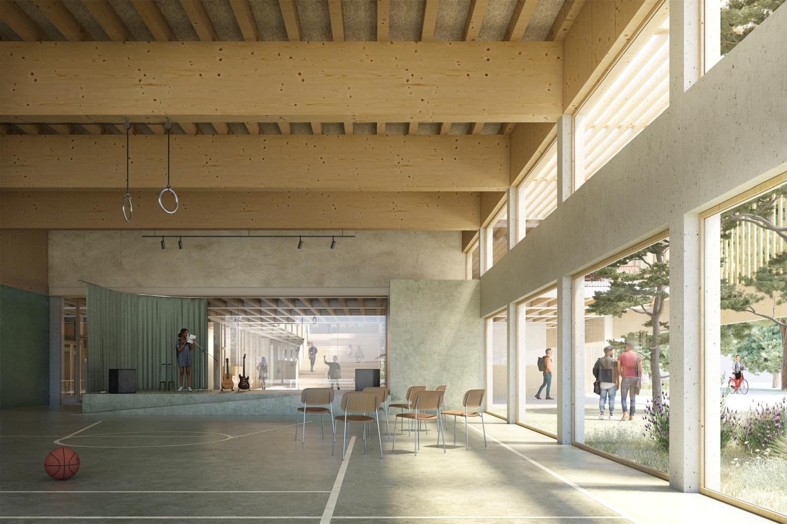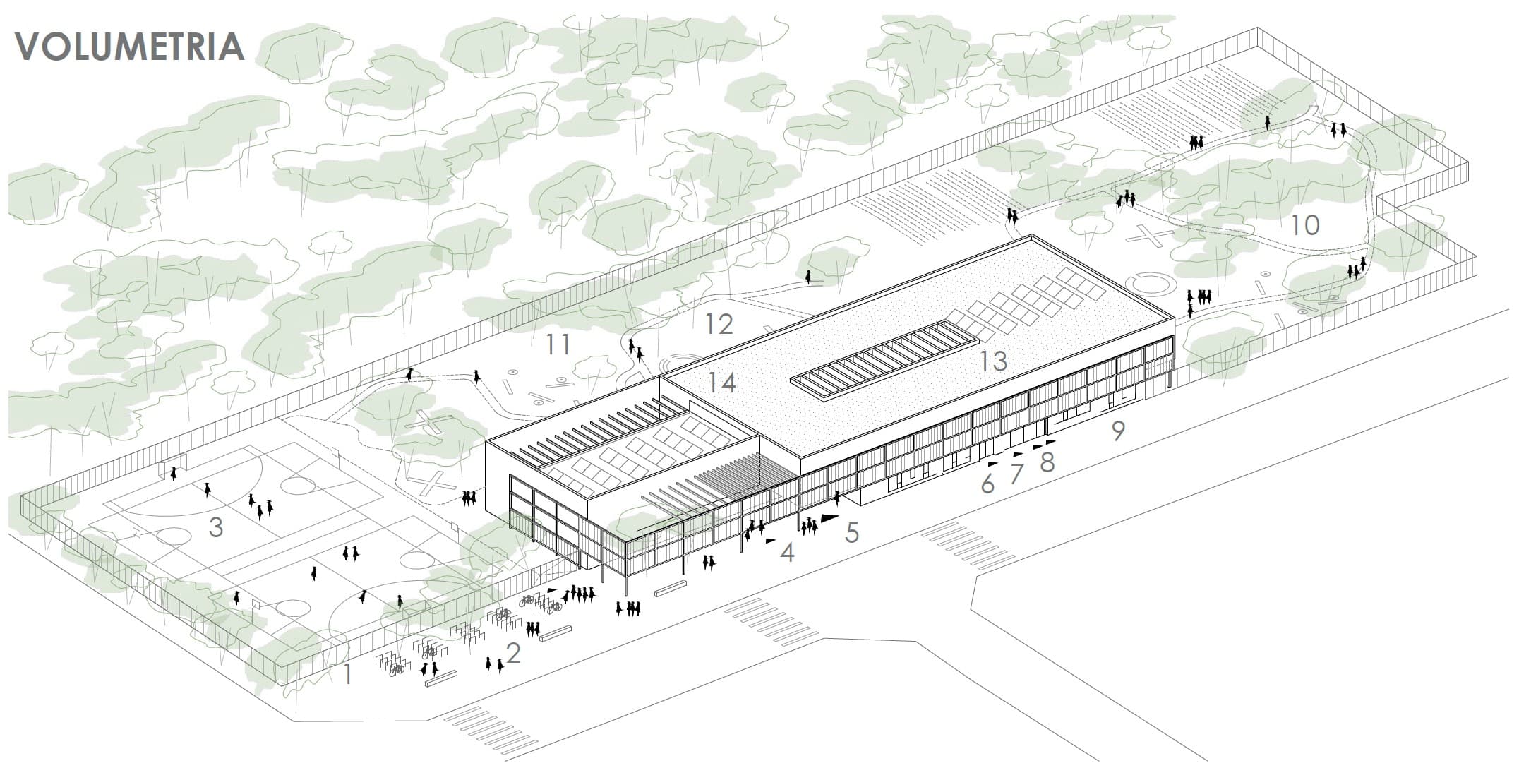 La proposta aposta per un edifici compacte: a nivell volumètric, s’hi integren el poliesportiu i l’edifici d’aules, optimitzant el control d’accés i reduint les pèrdues energètiques. Es minimitza l’envolupant global de l’edifici.